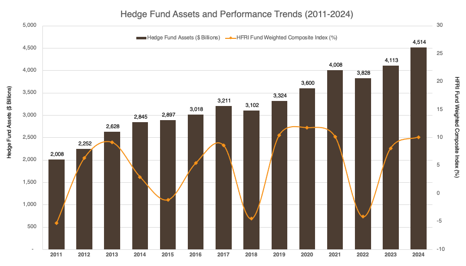 At the same time, the industry’s growth created a problem of its own: overcrowding. By 2024 hedge fund assets under management exceeded $4.5 trillion globally but this growth has not been matched by performance.