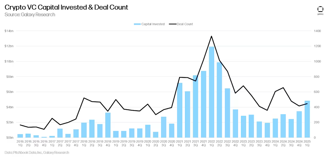 Crypto venture capital investment and deal activity have fluctuated sharply, with recent years showing a decline from earlier peaks. Source: Galaxy.com