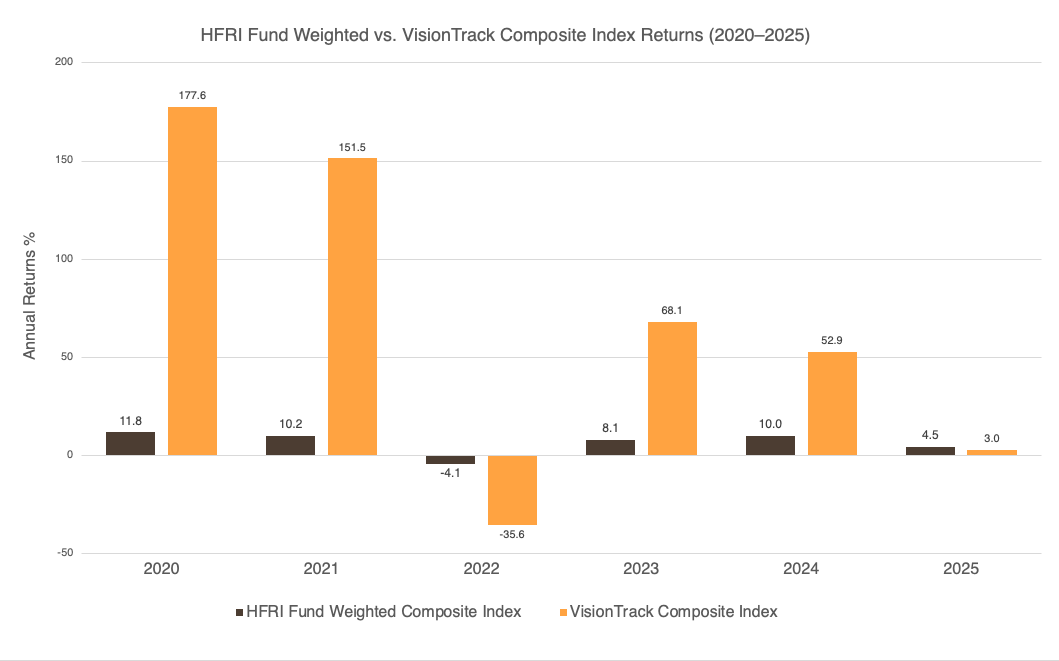 The clearest way to assess crypto hedge funds is by their results, and index data shows they have consistently outpaced their traditional peers. For example, the VisionTrack Crypto Hedge Fund Composite Index returned +68.1% in 2023 and +52.9% in 2024, compared with +8.1% and +10.0% respectively for the HFRI Fund Weighted Composite. Even when adjusted for higher volatility, Sharpe ratios across many crypto strategies remain competitive with, and in some cases exceed, those of equity long/short and macro funds.