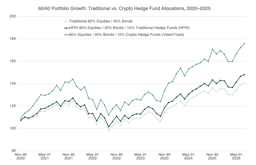 Replacing 10% of equities in a 60/40 with traditional hedge funds (HFRI) improved return and Sharpe modestly. By contrast, replacing 10% with crypto hedge funds (VisionTrack) delivered a meaningfully larger uplift in return and Sharpe, with only a moderate increase in volatility. This indicates that crypto hedge funds behave like a distinct building block that can improve portfolio efficiency more than a traditional HF sleeve in this window.