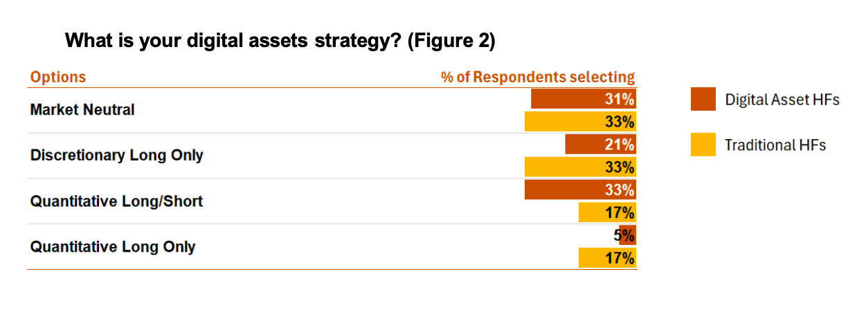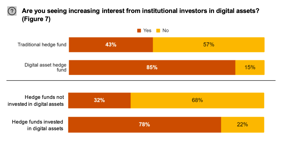Furthermore, the survey results suggest that institutional interest in digital assets is expanding, albeit at varying levels across market participants. Among hedge funds already invested in digital assets, 78% report an increase in institutional investor interest. However, for those without crypto exposure, only 1 in 3 have seen a similar uptick. This suggests that institutional investors prefer to explore digital assets with funds that have pre-existing experience in the asset class.