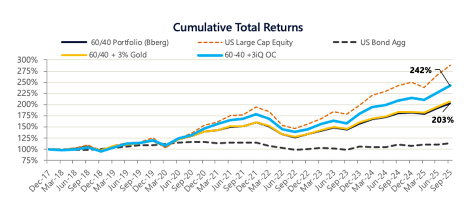 When introduced into a traditional 60/40 portfolio, even at modest size, Optimized Core materially alters portfolio outcomes. A 3% allocation improves nominal returns, enhances risk-adjusted performance, and reduces downside volatility. Despite its small weight, the OC allocation contributes a disproportionate share of total portfolio returns over the analyzed period.