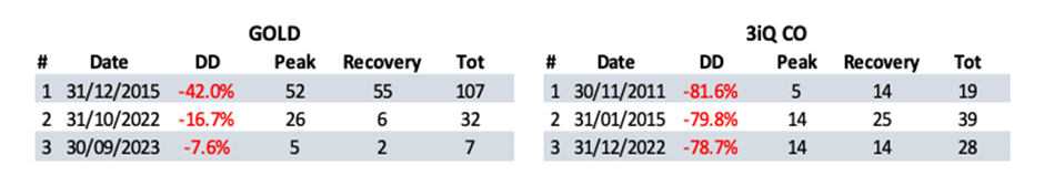 As mentioned, gold has historically played an important role as a portfolio diversifier, particularly during periods of monetary stress. Its drawdowns often unfold gradually and can take extended periods to recover, introducing timing risk and opportunity cost.